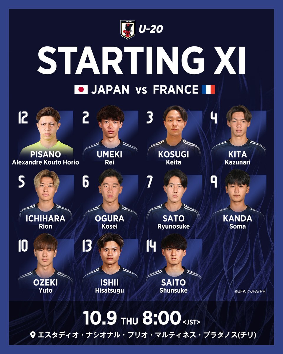 🔹U-20日本代表🔹 📝LINE-UP📝 🏆FIFA U-20ワールドカップチリ2025 ⚔️ラウンド16 12 #ピサノアレクサンドレ幸冬堀尾(GK) 2 #梅木怜 3 #小杉啓太 4 #喜多壱也 5 #市原吏音(C) 6 #小倉幸成 7 #佐藤龍之介 9 #神田奏真 10 #大関友翔 13 #石井久継 14 #齋藤俊輔 𝐒𝐔𝐁🔄 1 #中村圭佑(GK) 21
