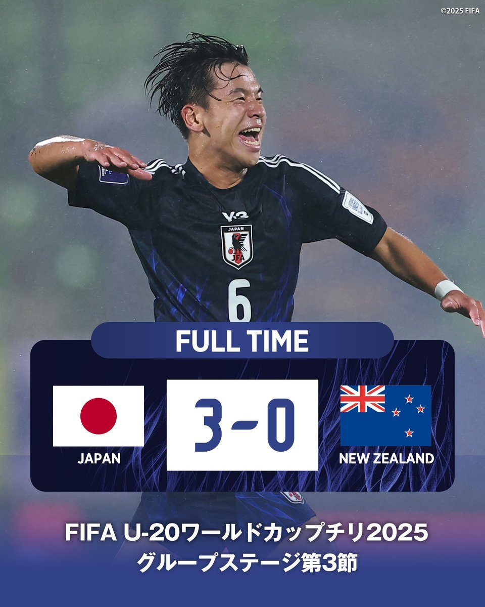 🔹️試合終了🔹️ 🏆FIFA U-20ワールドカップチリ2025 ⚔️グループステージ第3節 🇯🇵U-20日本代表 3-0 U-20ニュージーランド代表🇳🇿 ⌚️8:00(🇯🇵) 📺 J SPORTS 3 / J SPORTSオンデマンド(jod.jsports.co.jp/p/football/fif…) 🔗jfa.jp/national_team/… #U20WC @FIFAWorldCup #夢への勇気を #U20日本代表 #jfa