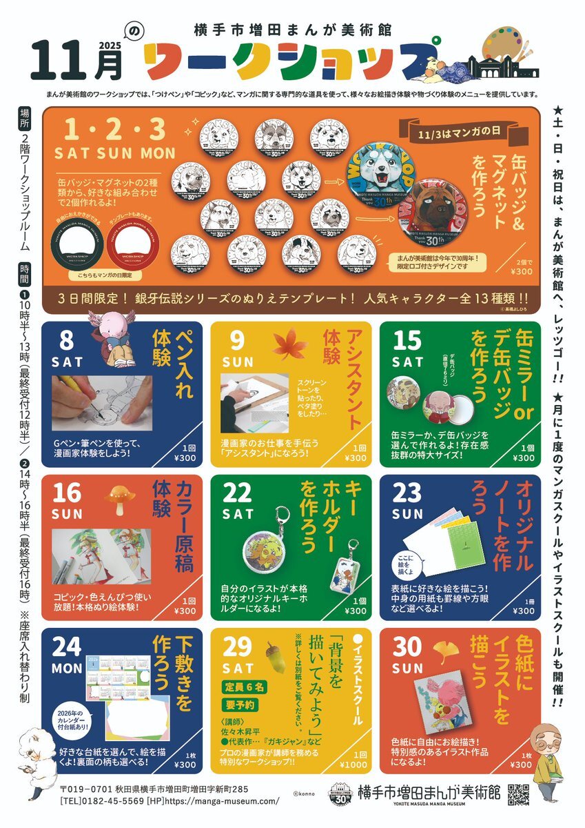 【週末 #ワークショップ のお知らせ】 11/15(土) 缶ミラーorデ缶バッジを作ろう(300円) 11/16(日) カラー原稿体験(300円) 画材を自由に使って特大サイズのアイテム制作やぬり絵体験ができます✍ #横手市増田まんが美術館 pic.x.com/NrPvzbgCED