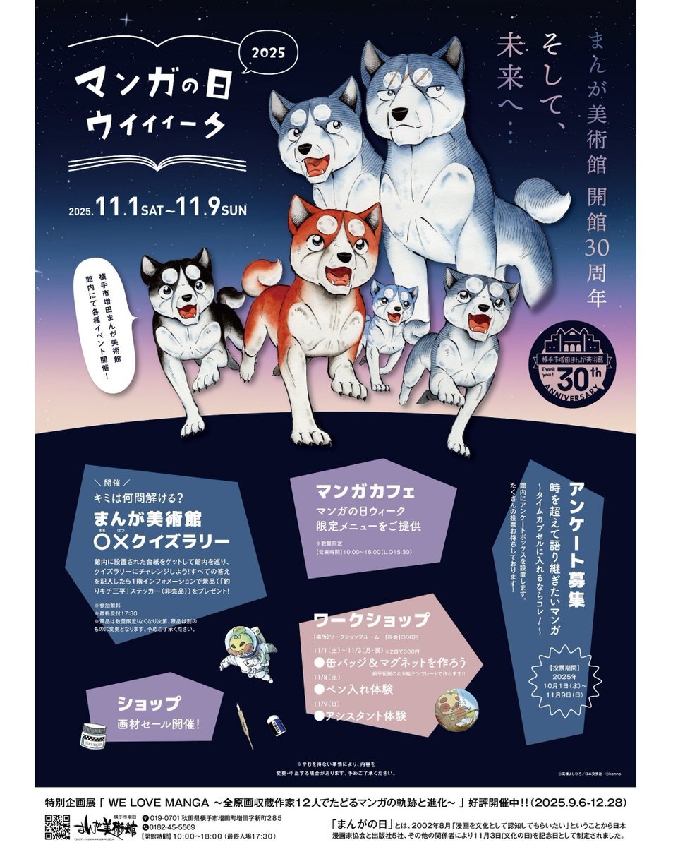 \2025マンガの日ウィーク開催🎊/ 本日11/1(土)~11/9(日)の9日間、#横手市増田まんが美術館 では各種イベントを開催します✨今年のテーマは『まんが美術館30周年 ~そして、未来へ・・・~』 館内を巡るクイズラリーや画材セール、カフェでの限定メニュー提供など、盛りだくさんの9日間! pic.x.com/287uIsGOf8