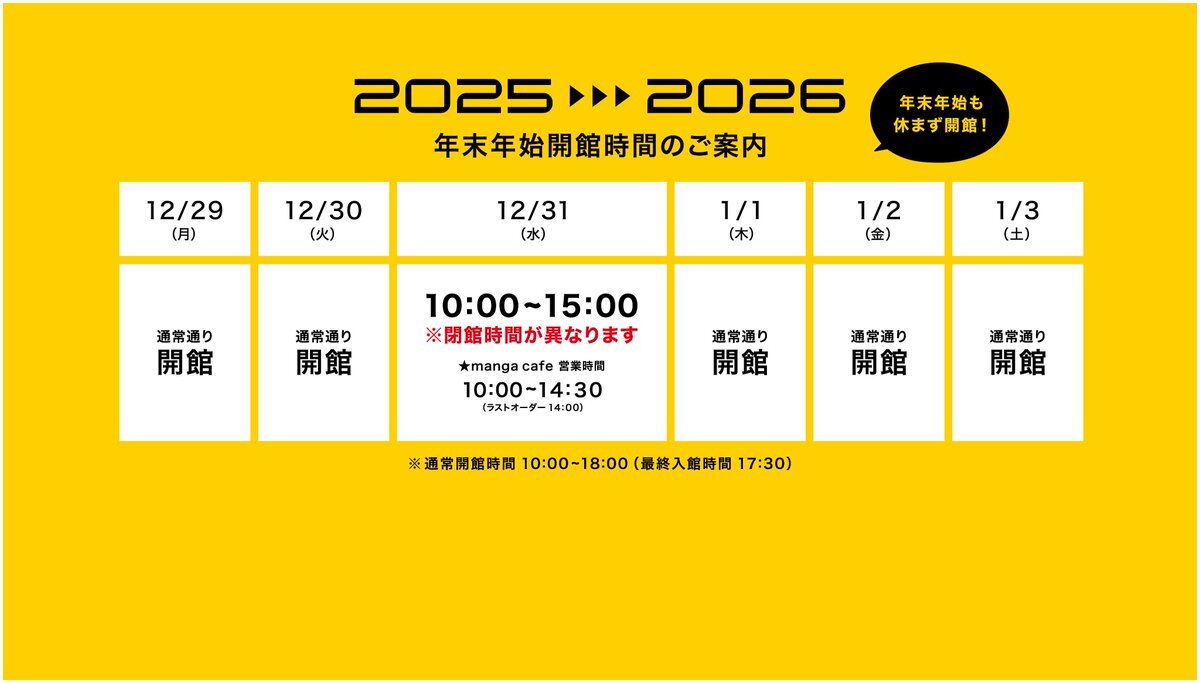 【年末年始の営業時間について】 ホームページにて年末年始の開館時間についてお知らせしております。 詳しくはこちら manga-museum.com/2025-2026/ #横手市増田まんが美術館 pic.x.com/mIKMQRDwTj