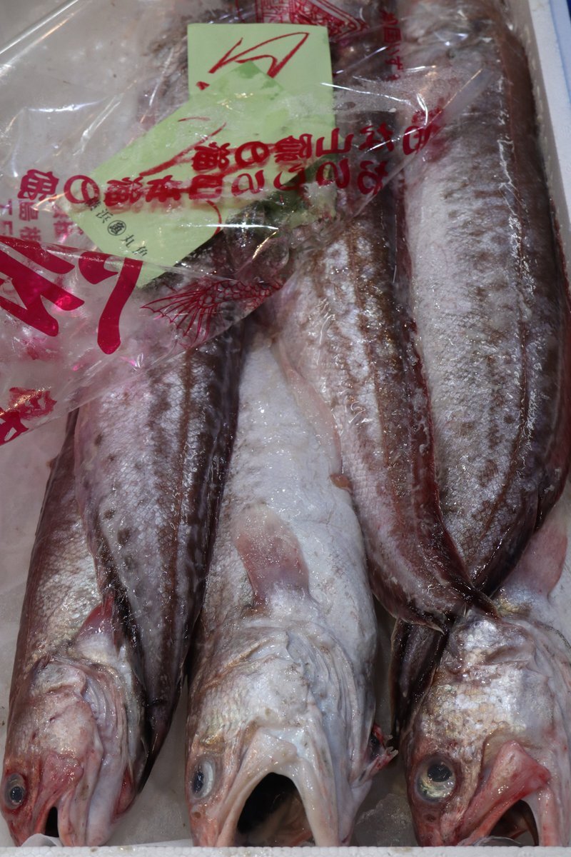 出雲の国からやってきた「ヒゲダラ」本名「ヨロイイタチウオ」旬は秋から冬で価値のある大型は釣りもの、小型は底引き網漁で。大型は昆布締めにされることが多いようですね。#横浜中央卸売市場 #魚のことなら坪倉水産 #飲食店仕入れ #業務用食材 #寿司職人 #和食職人 #ヒゲダラ #旬の魚 pic.x.com/AdScAXphMr