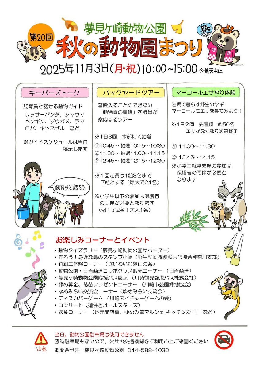 11月3日(祝)は #夢見ヶ崎動物公園 動物園まつり🍂 バックヤードツアー(裏側見学)、 飼育員キーパーズトーク、 マーコール餌やり、クイズラリー、#臨港バス 展示、キッチンカー、コンサート、団体ブースなど、楽しいイベントが盛り沢山です✨ ご来園お待ちしております! ⚠️駐車場は利用不可です