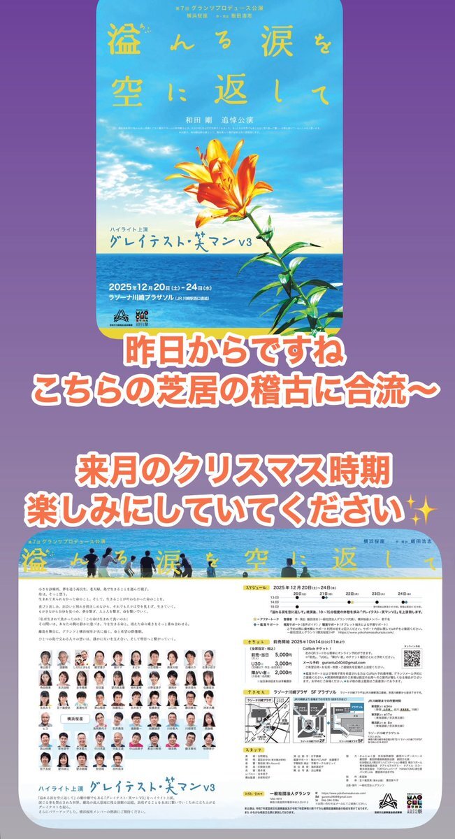 \\本日は横浜桜座と交流WS‼️// 『#溢れる涙を空に返して』組が #横浜桜座 の『#グレイテスト・笑マンV3』鑑賞。 そのあと交流WSを行い大盛り上がり。 このコラボを観ていただきたい。 ◇2025/12/20〜24 ◇ラゾーナ川崎プラザソル ◇チケット申込み▶️stage.corich.jp/stage/394516/t… pic.x.com/5KzrIrT7Xn