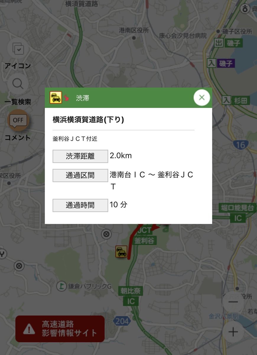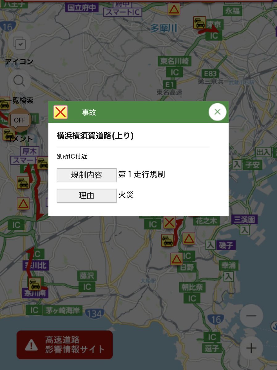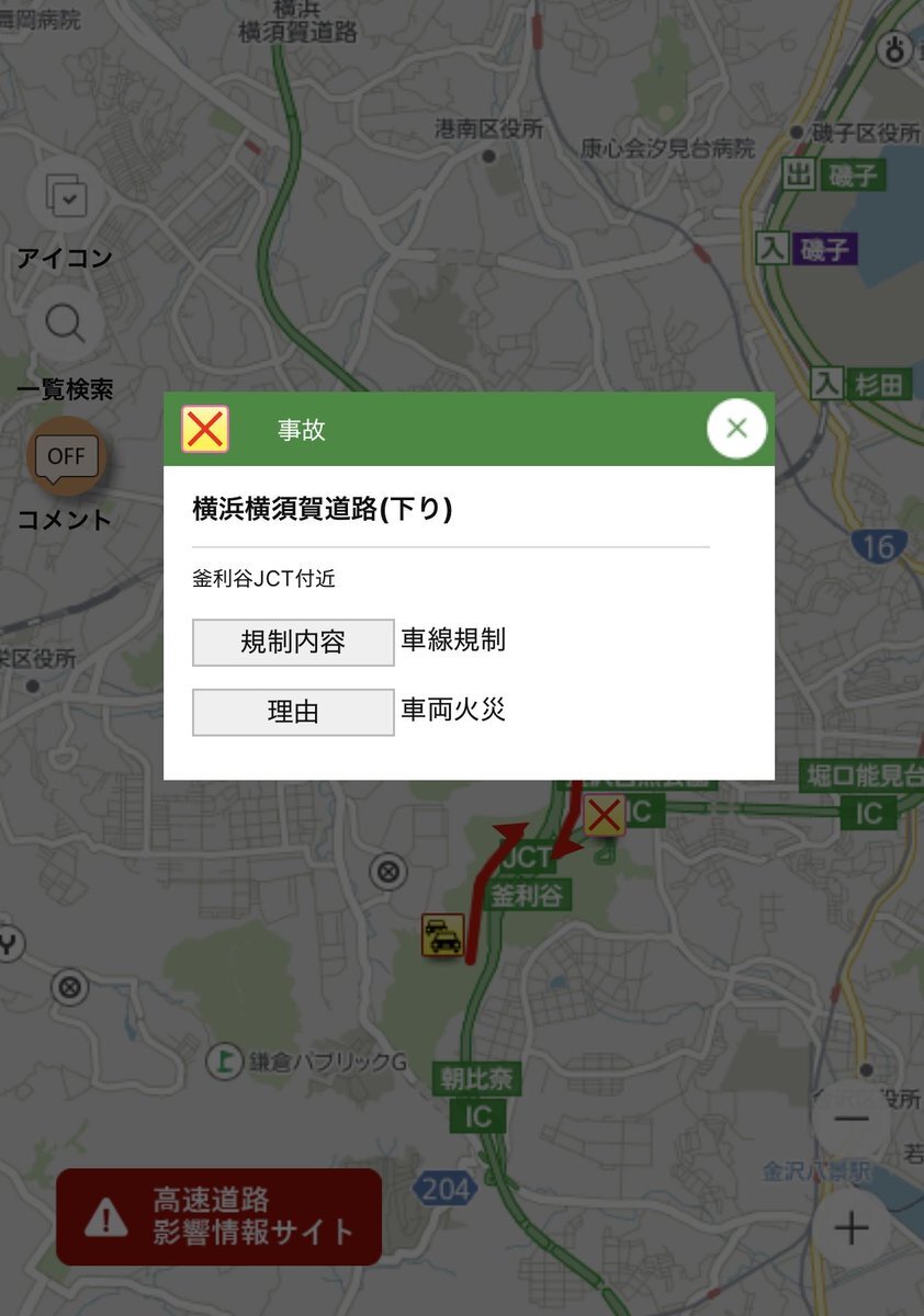 #横浜横須賀道路 #交通情報 15:50現在 横浜横須賀道路下り 釜利谷jct付近 車両火災・車線規制 港南台ic→釜利谷jct 2km10分🔺 drivetraffic.jp/realtime-area?… pic.x.com/ccu2LrG3F1
