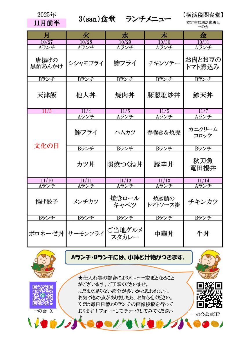 お疲れ様です😃 本日の横浜税関食堂は、スパニッシュオムレツと、鯵竜田揚げ丼となっております🎶 横浜市営地下鉄が時刻表を撤去しQRコードにしてしまったのが話題ですねⓂ️ 当会利用者さんもスマホ率は低いので是正して欲しいですね✨ 本日もよろしくお願いします😊🌈 #横浜税関食堂 #横浜税関 pic.x.com/c0eF1I577E