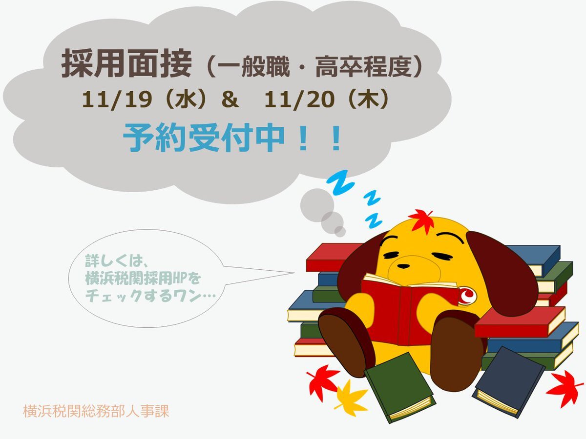 【採用案内】 #横浜税関 では11/19(水)と11/20(木)に一般職(高卒程度)向けの採用面接を実施するワン!まだまだ予約受付中だよ🐾詳しくは横浜税関の採用ページをチェック! customs.go.jp/yokohama/saiyo… #国家一般職 #高卒 #官庁訪問 pic.x.com/FpQAbzdGKr