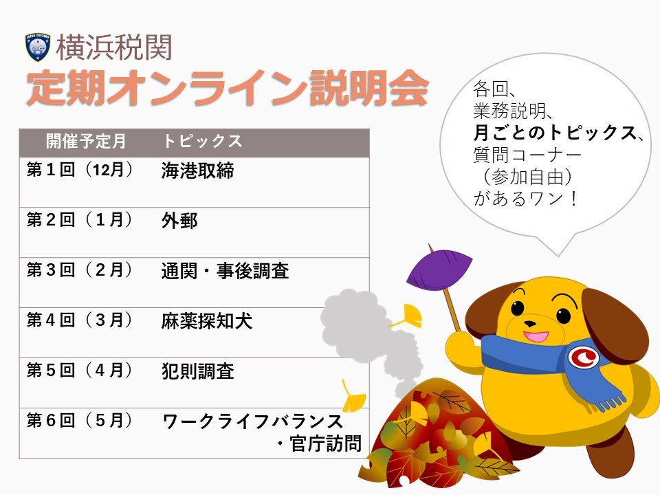 【採用案内】 #横浜税関 定期オンライン説明会の開催が今年も決定したワン!12月から月1回開催予定🐾初回は12/19(金)だよ♪詳しくは横浜税関の採用ページをチェック! customs.go.jp/yokohama/saiyo… #国家一般職 #オンライン #税関 pic.x.com/46Wk2huTJ1