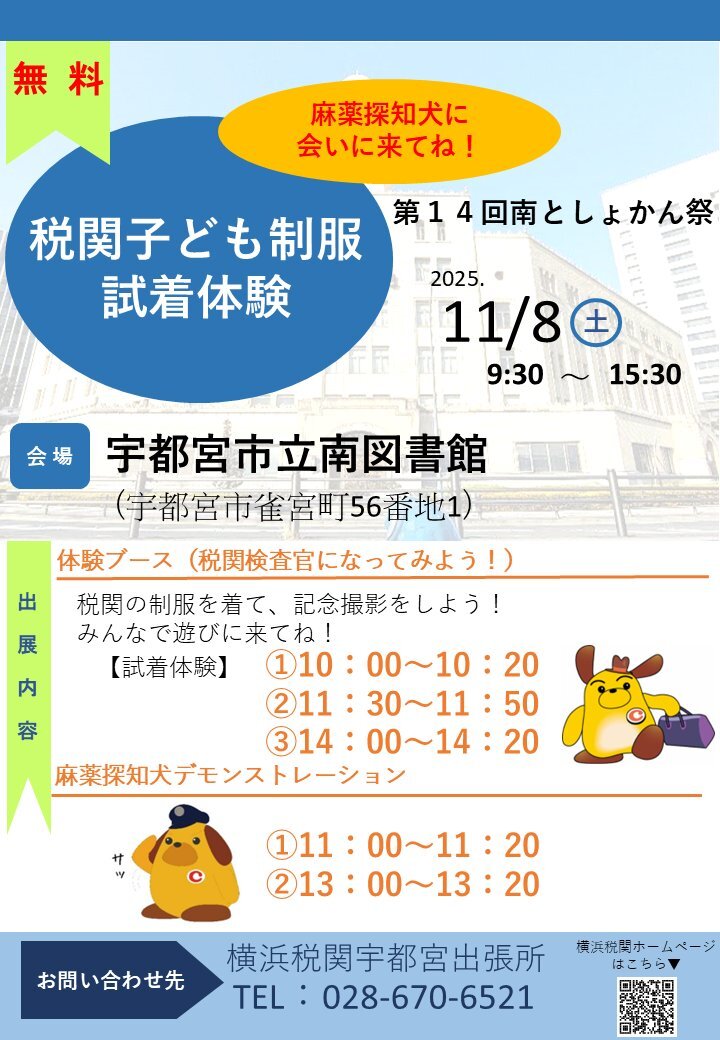 【イベント】 #横浜税関 宇都宮出張所は、11/8(土)に宇都宮市立南図書館で開催される「南としょかんまつり」に参加するワン! 麻薬探知犬デモンストレーションや税関子ども制服試着体験を行うよ! みんな遊びに来てほしいワン🐾 #宇都宮 #カスタム君