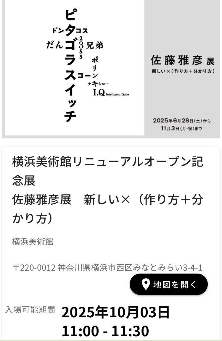 ということで、 先日無事に交換できました🙌 横浜美術館 佐藤雅彦展 2025年10月24日 10:30 - 11:00 チケット2枚 ……えっとですね。欲しい方は譲りますので、ご連絡ください笑 #またしても行けない #横浜美術館 #佐藤雅彦展 #ピタゴラスイッチ x.com/eb22nyanyan/st…