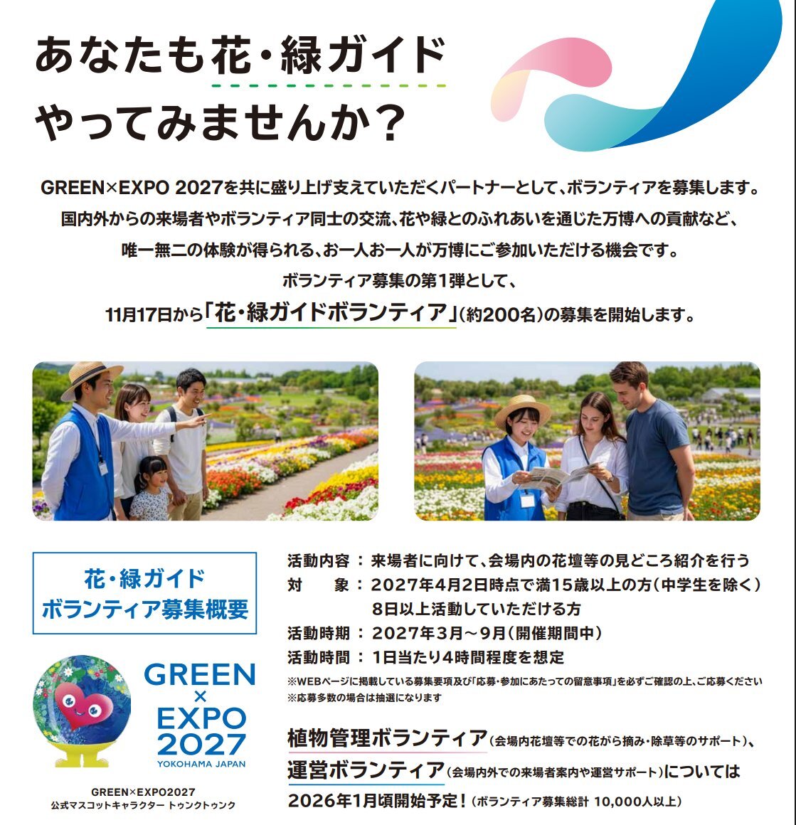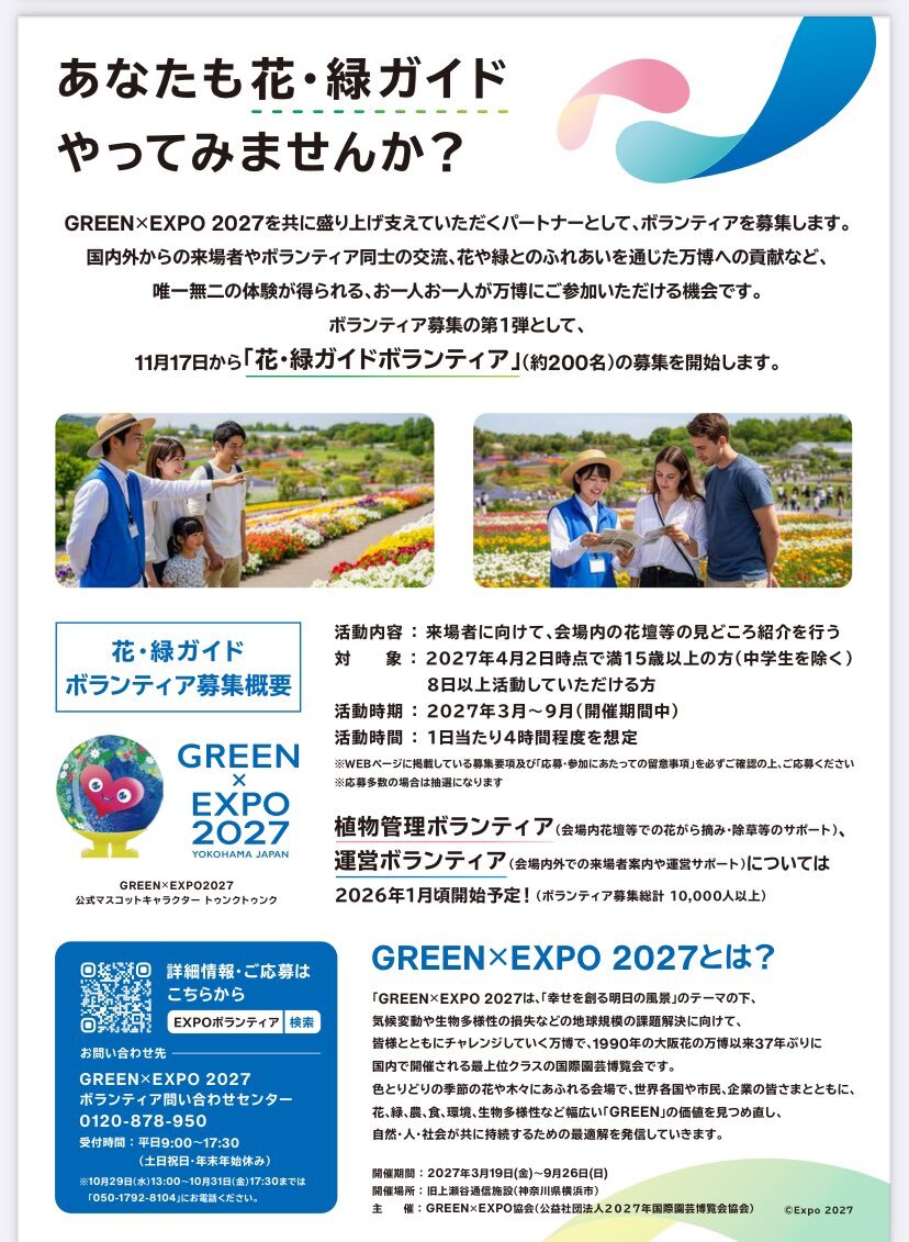 【お知らせ】 「花・緑ガイドボランティア」の募集を開始しました。 expo2027yokohama.or.jp/sponsorship/vo… #横浜花博 #横浜国際園芸博覧会 #GREENEXPO2027