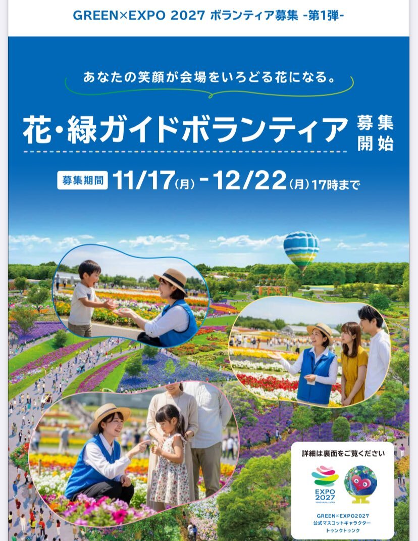 「園芸博ボランティア第1弾募集開始!!」 【花・緑ガイド】約200名の募集! 📅応募期間:11/17(月)~12/22(月)17時 📍活動期間:2027年3月~9月 ⏰1日4時間程度×8日以上 👤対象:15歳以上(中学生除く) ※応募多数の場合は抽選 expo2027yokohama.or.jp/sponsorship/vo… #園芸博 #GREENEXPO2027 #横浜花博