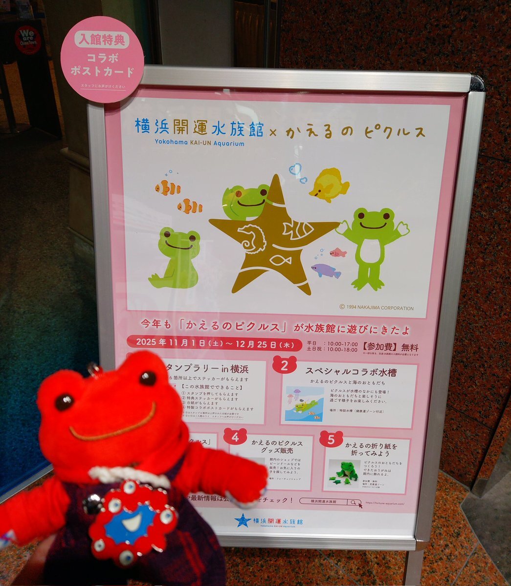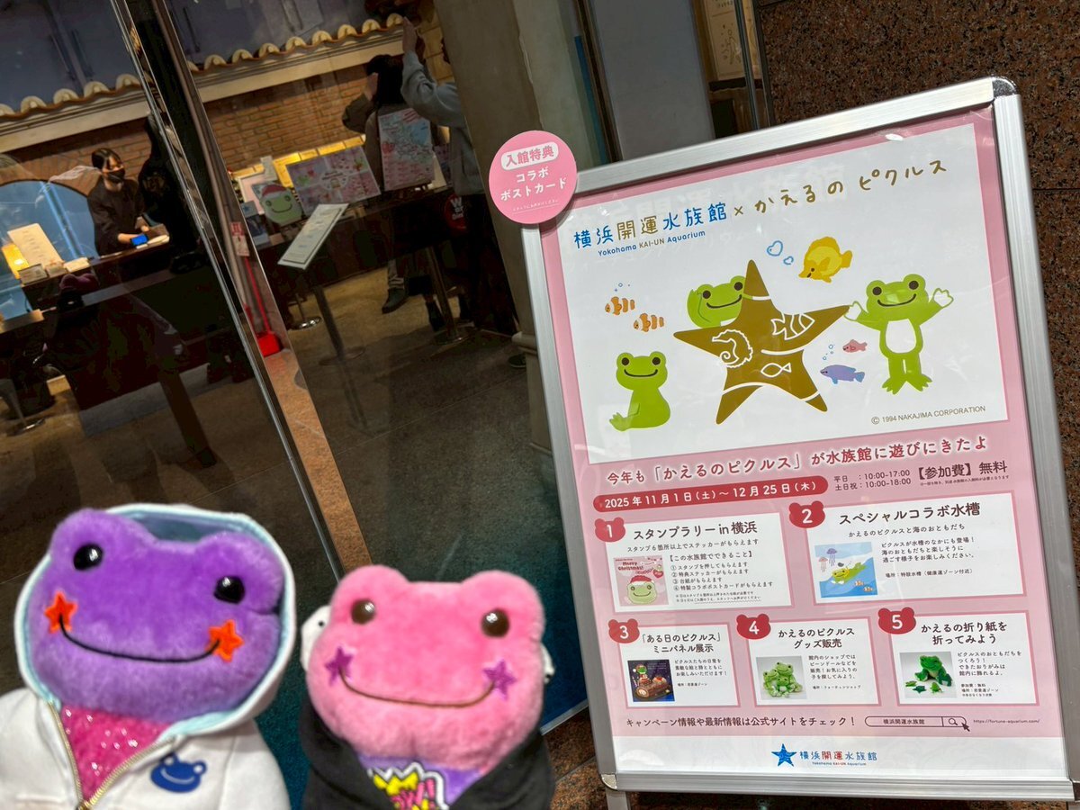 おはようございます🍀 本日は当館の館内情報をお届けします❣️ ついに今日から #かえるのピクルス とのコラボイベント 「かえるのピクルス2025 Merry christmas!スタンプラリー in横浜」が始まりました!👏 #横浜開運水族館 の入り口ではカラフルなピクルスたちが お出迎えしています!🐸 pic.x.com/c6Rbe64PJm