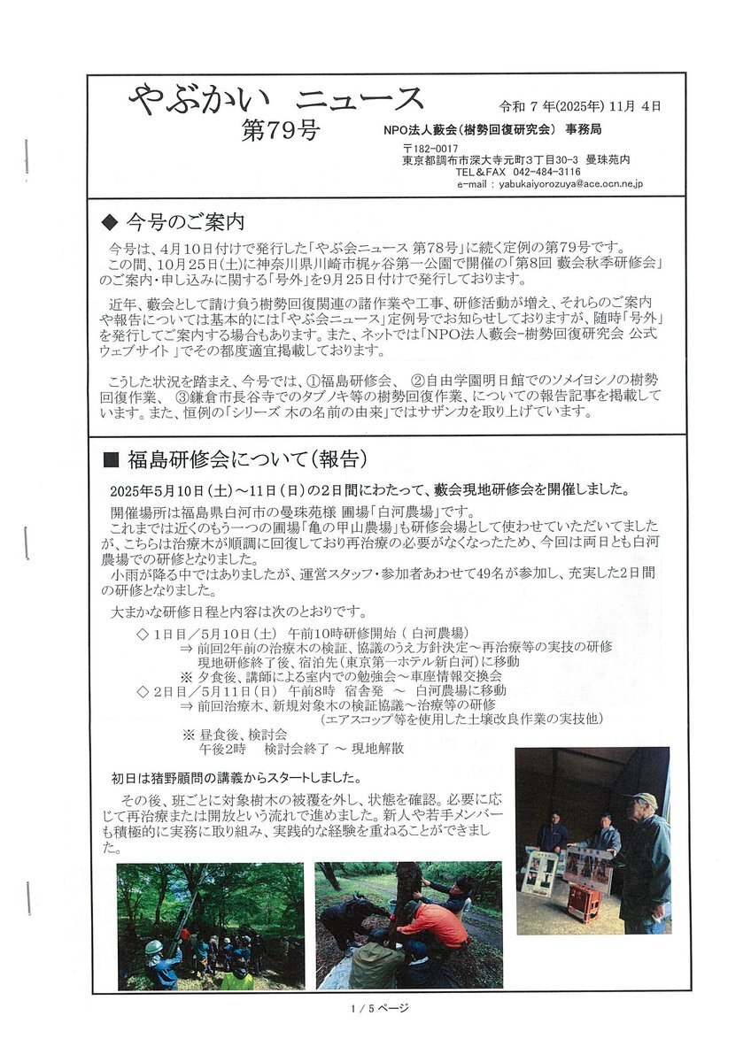 会員の皆さんにやぶかいニュース第79号を発送しました。 福島研修や自由学園と長谷寺の樹勢回復作業の報告が載っています。#藪会 #樹木保護 #樹勢回復 #樹木治療 #土壌改良 #わかほ #キノネデール #不定根誘導 pic.x.com/nv7i5an836