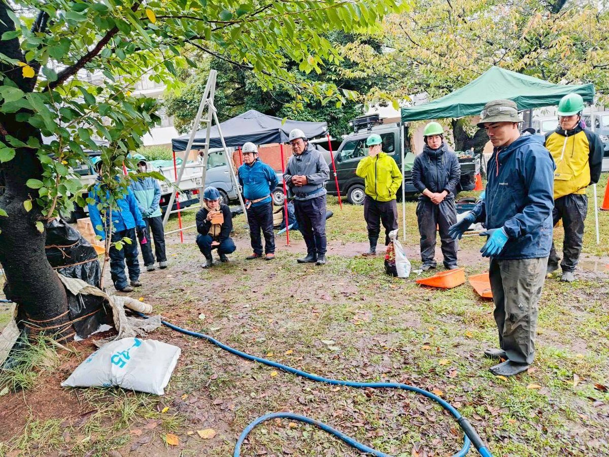 10月25日に川崎市の公園で研修会を開きました。 生憎の天気でしたが運営スタッフを含め16人の参加がありました。 今回は2年前に治療したサクラの保守点検・経過観察と土壌改良を行いました。 #藪会 #樹木保護 #樹木治療 #樹勢回復 #土壌改良 #わかほ #キノネデール #不定根誘導 #ソメイヨシノ pic.x.com/u4HZtdO70s