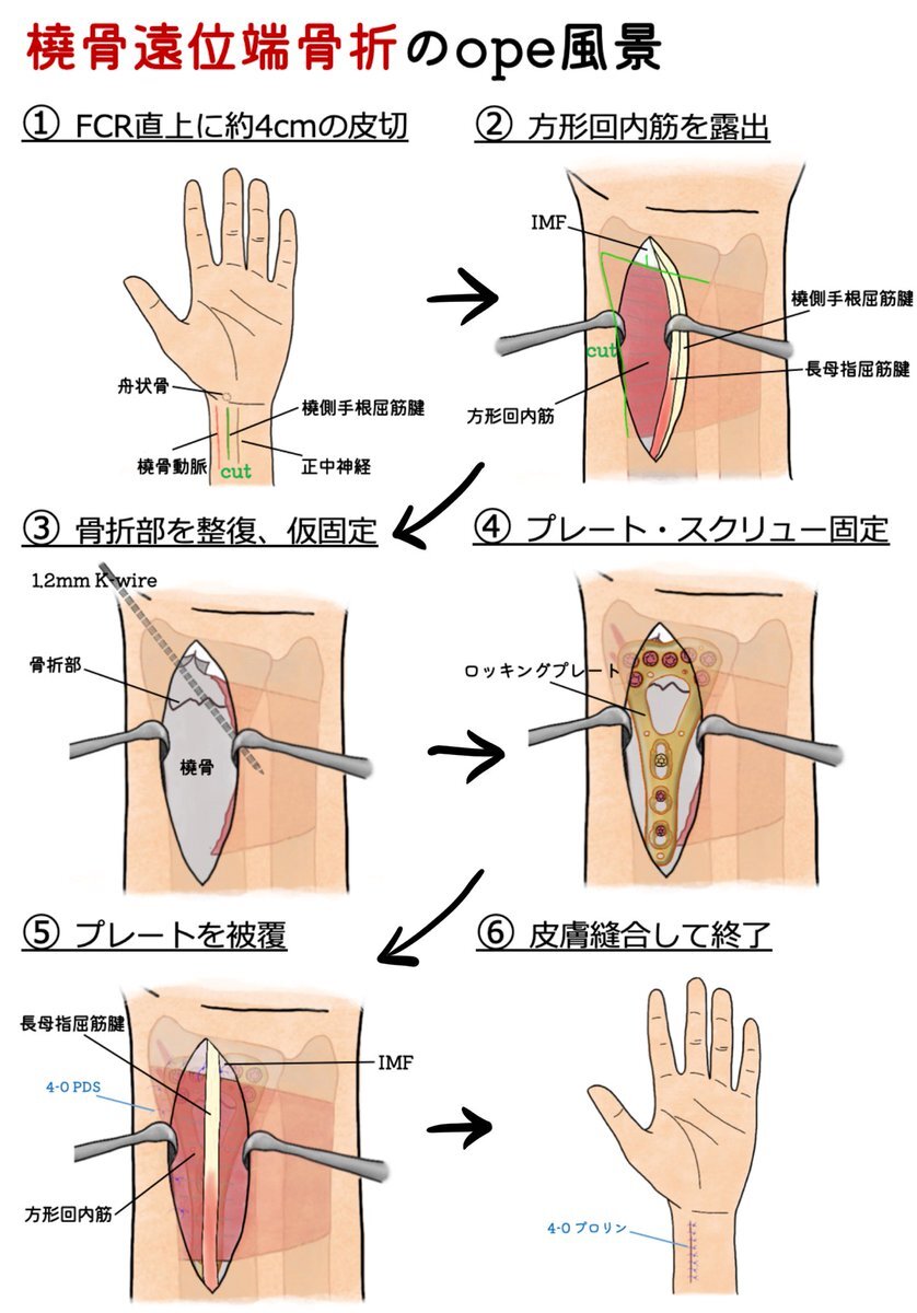 橈骨遠位端骨折のope風景(一例)を書いてみました。②の展開の時点で綺麗に方形回内筋を展開し(転位、開放創などでそもそも損傷していることも)、⑤でFPLの滑走部を覆いきることが重要。 覆えなかったら腱損傷のリスクが高まるため、早め抜釘とする。 #橈骨遠位端骨折 #整形日記 #opeイラスト日記 pic.x.com/OnGYPWNXJd