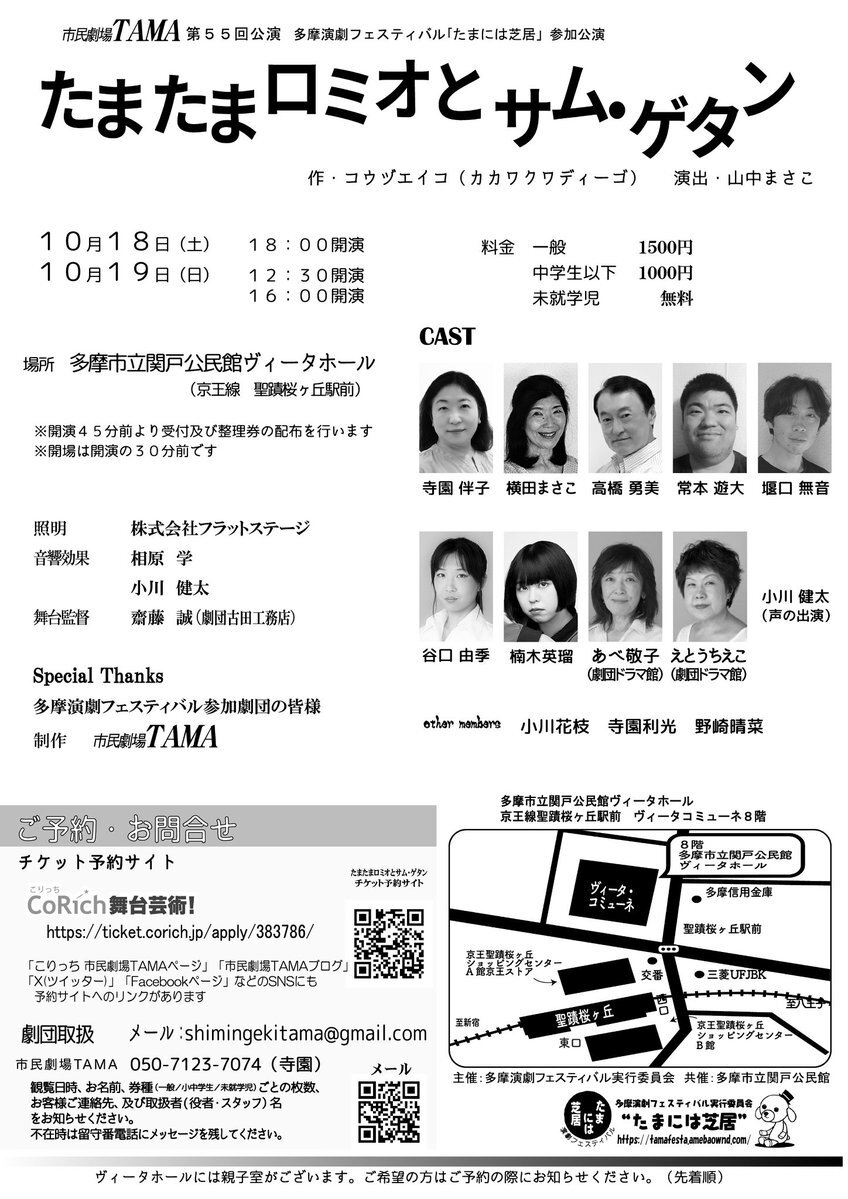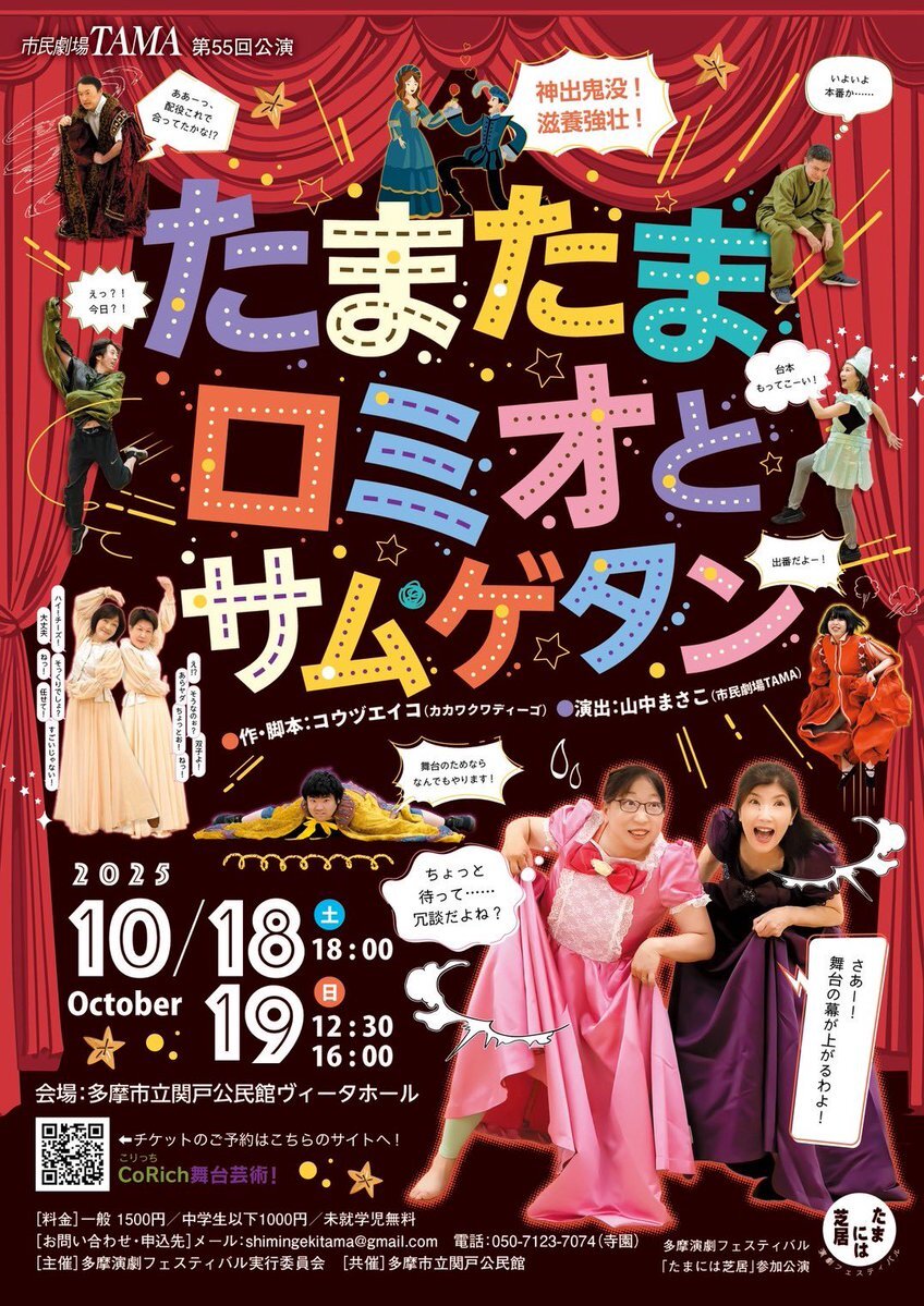 【出演情報】 市民劇場TAMA 第55回公演 『たまたまロミオとサム・ゲタン』 10月18日(土),19日(日) @関戸公民館ヴィータホール(最寄:京王線 聖蹟桜ヶ丘駅) ✴︎料金:1500円 ✴︎ご予約 ticket.corich.jp/apply/383786/0… 「えっ、これ、本当に公演できるの?!」 ドタバタコメディ、開幕! #たまロミ