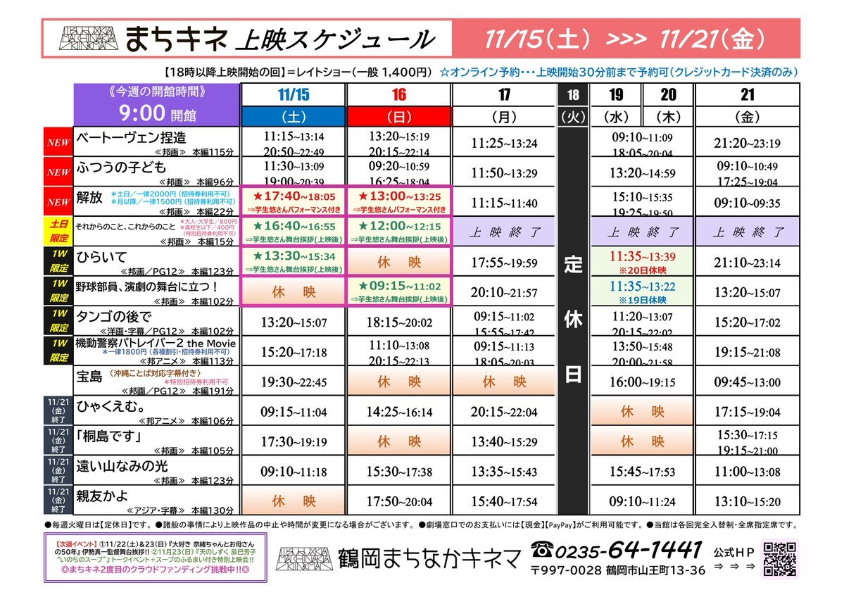 【発表📢】#まちキネ上映時間2025 11月15日(土)~11月21日(金)の上映スケジュールをお知らせ!土日は #芋生悠 さん初来館😆 🎬上映開始📽️ #ベートーヴェン捏造 #ふつうの子ども #映画解放 #それからのことこれからのこと #ひらいて #野球部員演劇の舞台に立つ #タンゴの後で #機動警察パトレイバー2 pic.x.com/ncAROB5Ulo