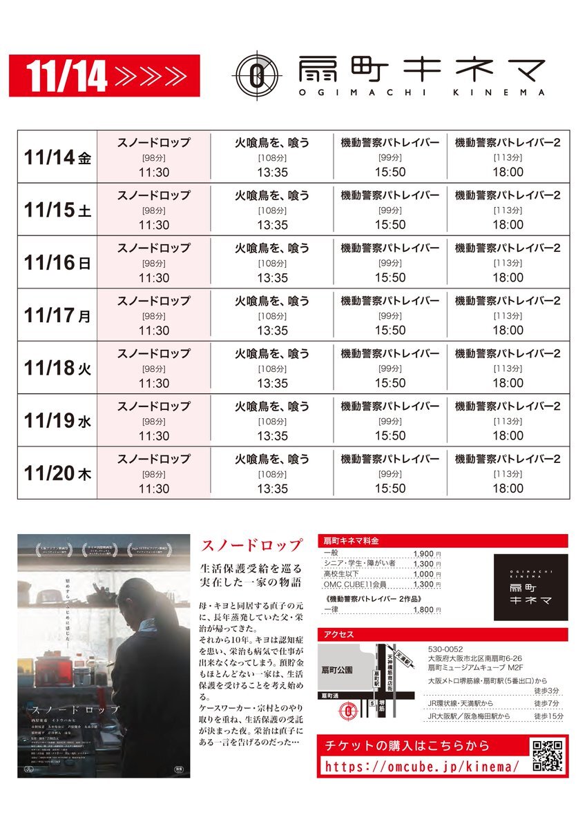 【#扇町キネマのスケジュール】 🗓️11/14(金)∼20(木) お待たせいたしました🍂 11/14から上映再開🔽 『#スノードロップ』 『火喰鳥を、喰う』#火喰鳥を喰う 『#機動警察パトレイバー』 『#機動警察パトレイバー2』 チケット👉x.gd/EAvuM pic.x.com/BA0YlYZ4In