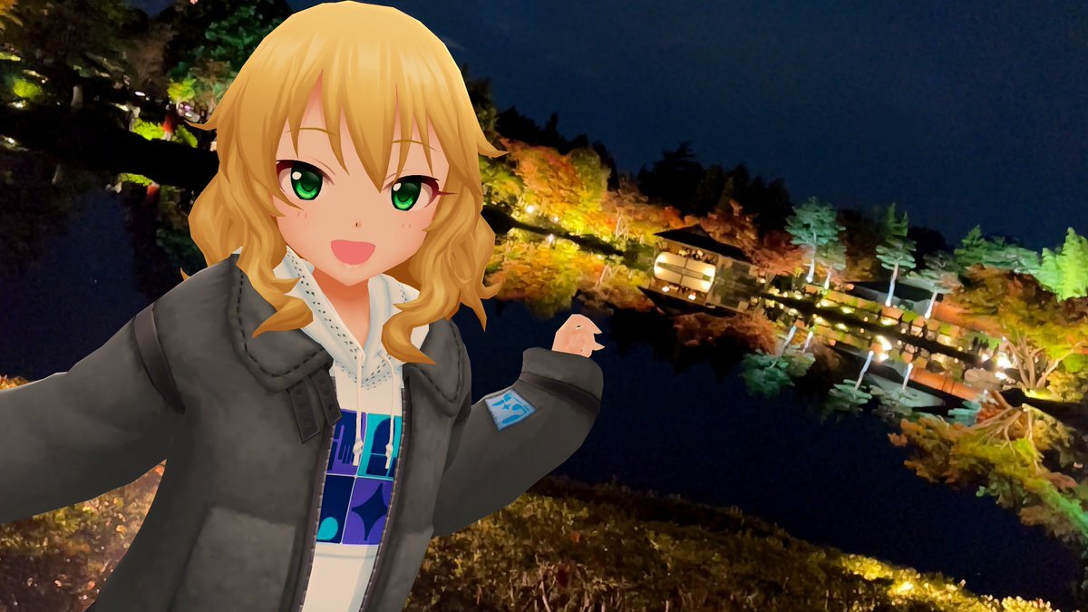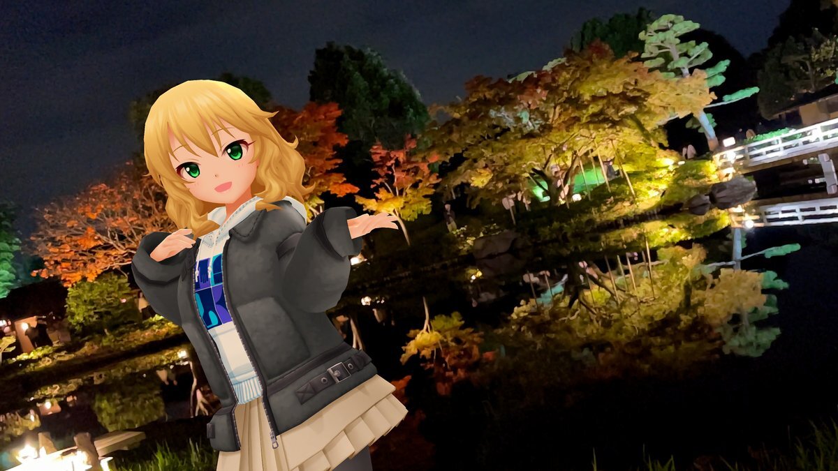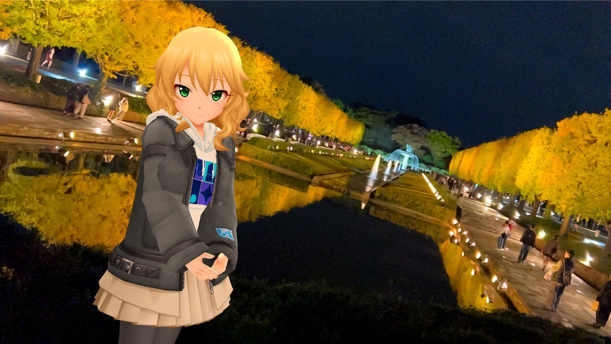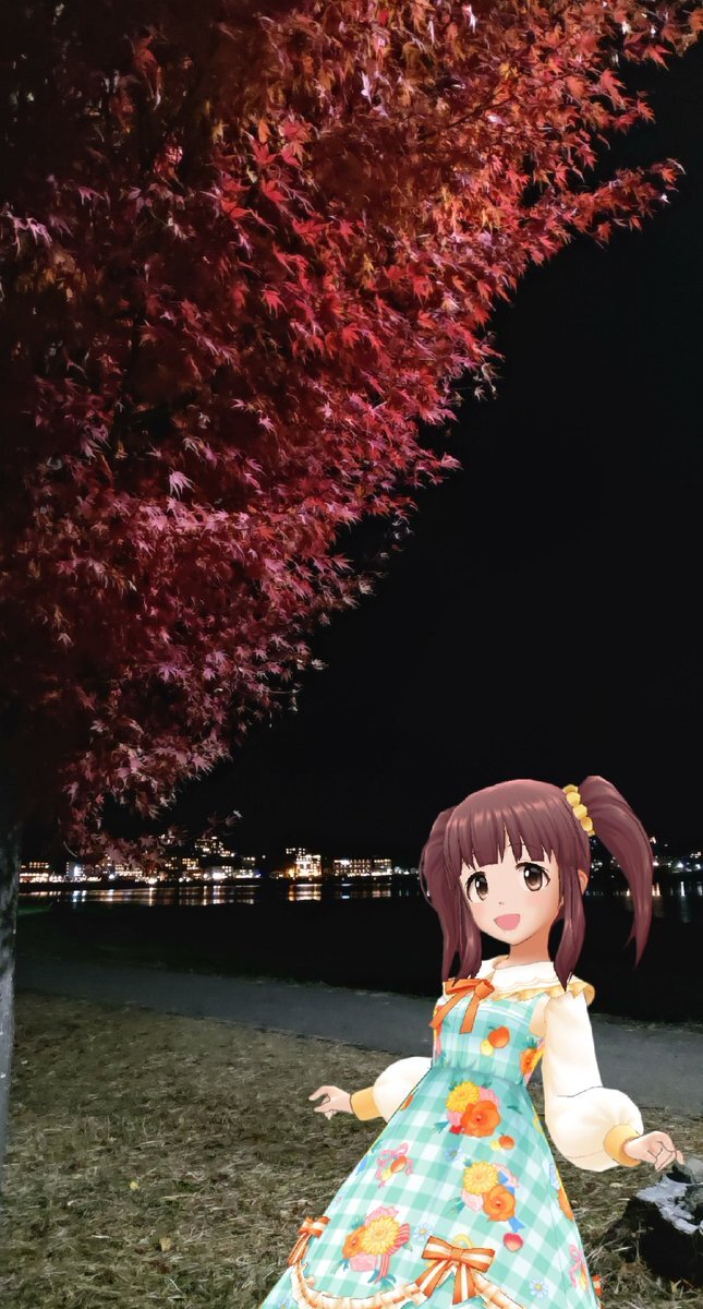 こちらは夜の昭和記念公園。 現在ライトアップイベント「夜の秋散歩」が開催中です。 ライトアップされた木々は日中とはちょっと違って見えますし、水面にも反射した木々が映し出されていて幻想的でした。 #デレステAR #デレスポAR #櫻井桃華 pic.x.com/UAdssKDGi0