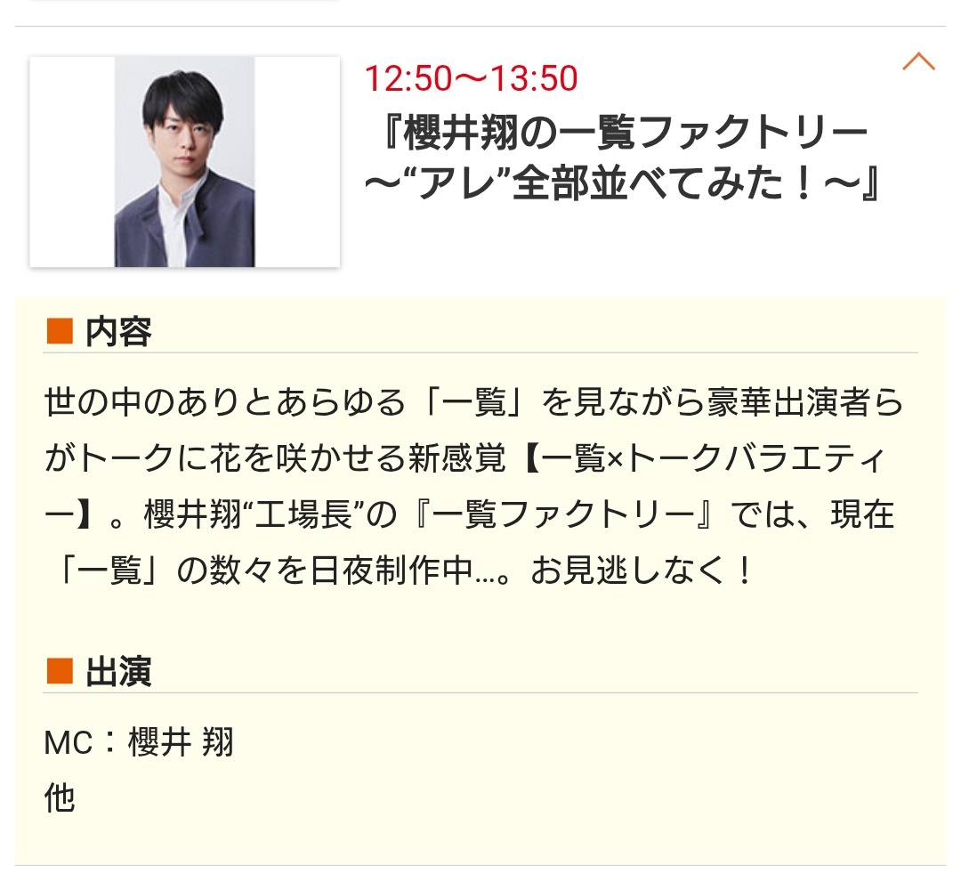 は?! なんでこんなふわっと特番情報www 12月30日12:50~13:50 『櫻井翔の一覧ファクトリー ~“アレ”全部並べてみた!~』 翔くんフジテレビで年末の特番きましたー #櫻井翔の一覧ファクトリー #櫻井翔 fujitv.co.jp/tokuhen/25wint…
