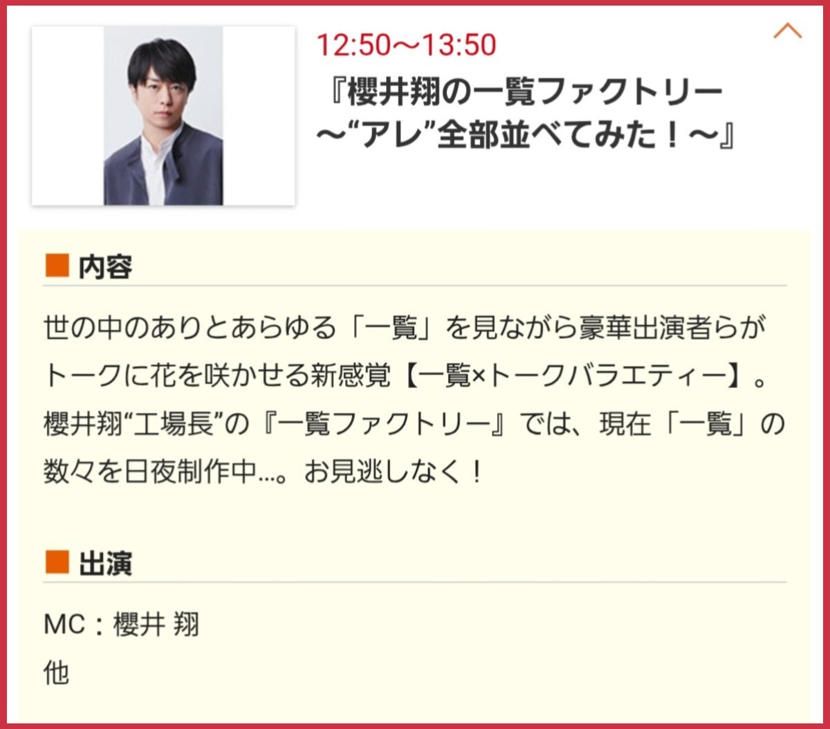 翔さんの特番😍なんて嬉しい誕プレ (関西でも見られるか) #櫻井翔の一覧ファクトリー 12月30日 12:50~13:50『櫻井翔の一覧ファクトリー ~“アレ”全部並べてみた!~』 fujitv.co.jp/tokuhen/25wint…