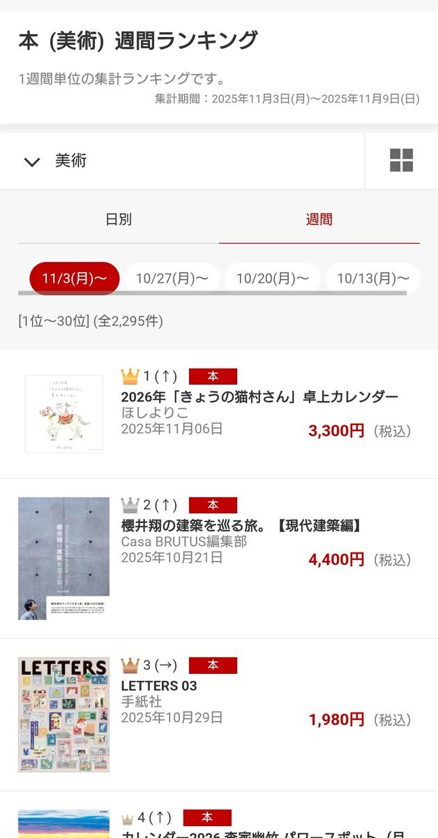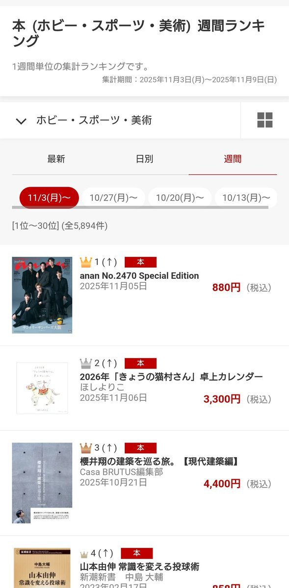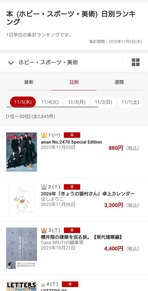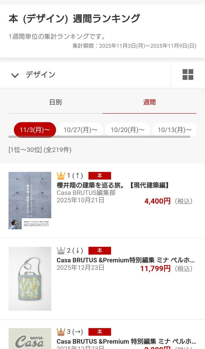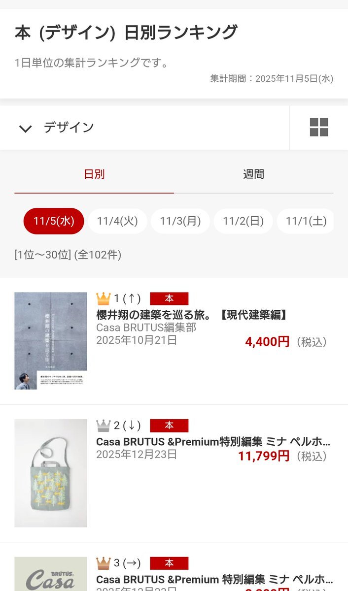 マガジンハウス 『櫻井翔の建築を巡る旅。【現代建築編】』 ◆ 楽天ブックス 集計期間|2025年11月5日 【本】ホビー・スポーツ・美術 日別ランキング:3位 🆙 【本】美術 日別ランキング:2位 🆙 【本】デザイン 日別ランキング:1位 🆙 ✨️ #櫻井翔の建築を巡る旅 #櫻井翔