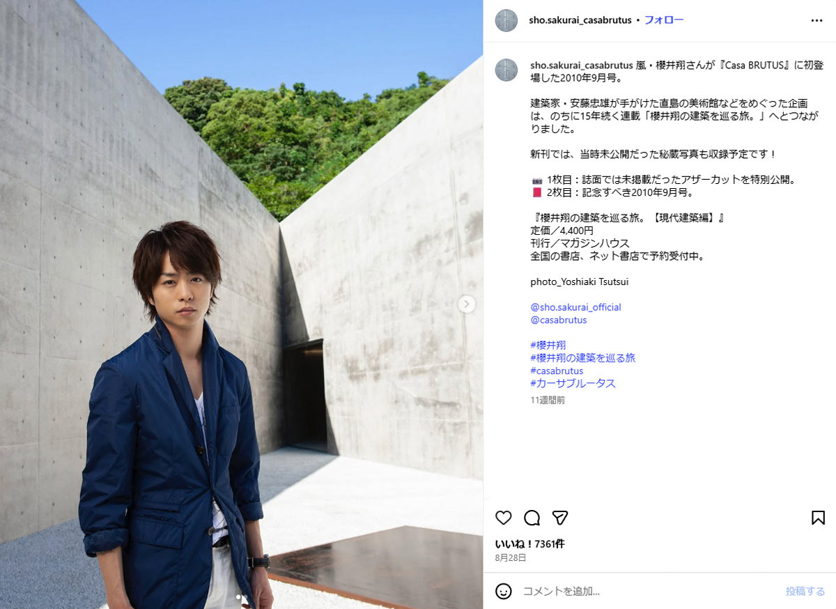 嵐の櫻井翔さんが『Casa BRUTUS』に初登場したのは2010年9月号。 「建築&アートの聖地『直島』へ。」と題した企画で、安藤忠雄が設計した美術館など瀬戸内の様々な施設を巡りました。 新刊では、当時未公開だった秘蔵写真も収録予定です! #櫻井翔 #櫻井翔の建築を巡る旅 photo_Yoshiaki Tsutsui