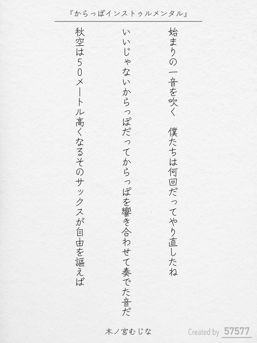 始まりの一音を吹く 僕たちは何回だってやり直したね いいじゃないからっぽだってからっぽを響き合わせて奏でた音だ 秋空は50メートル高くなるそのサックスが自由を謳えば / 木ノ宮むじな #短歌連作月まとめ blog.kotobadia.com/2223 #短歌 #次世代文学 pic.x.com/ZCztGCbWGo x.com/tankazine/stat…