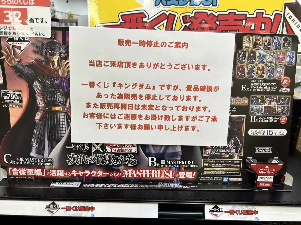 ⚠️【販売一時停止のお知らせ】 「春秋戦国大戦キングダム The Animation 次代の傑物たち」につきまして、 一部景品に破損が見つかったため、現在販売を停止しております。 ご購入を楽しみにされていた皆さまにはご迷惑をおかけし申し訳ございません。 #一番くじ #キングダム