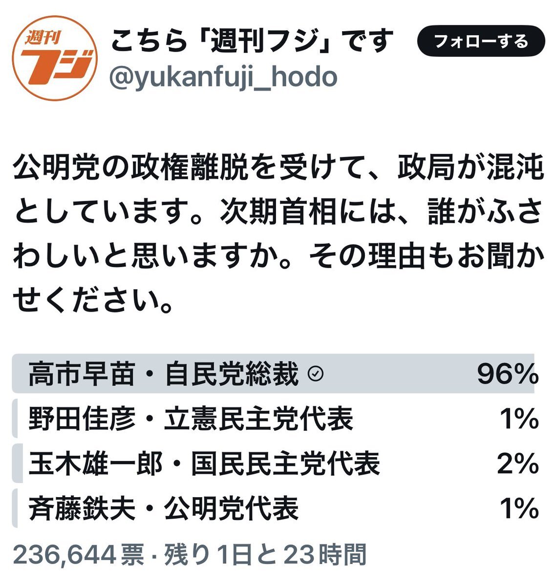 返信先:@FIFI_Egyptたったの21時間で、もう民意がはっきりと見えてますよ‼️ ♥ 20000 対 700 🤣🤣🤣 民意を無視して滅ぶか 民意を意識して再生するか #自由民主党 #自民党 #総裁選 #次期総理大臣 #国益の高市早苗 #炎上の小泉進次郎 pic.x.com/2oNvOj70Aa