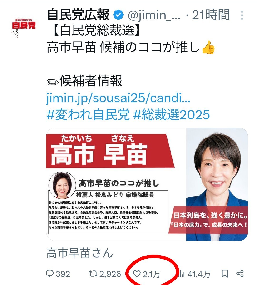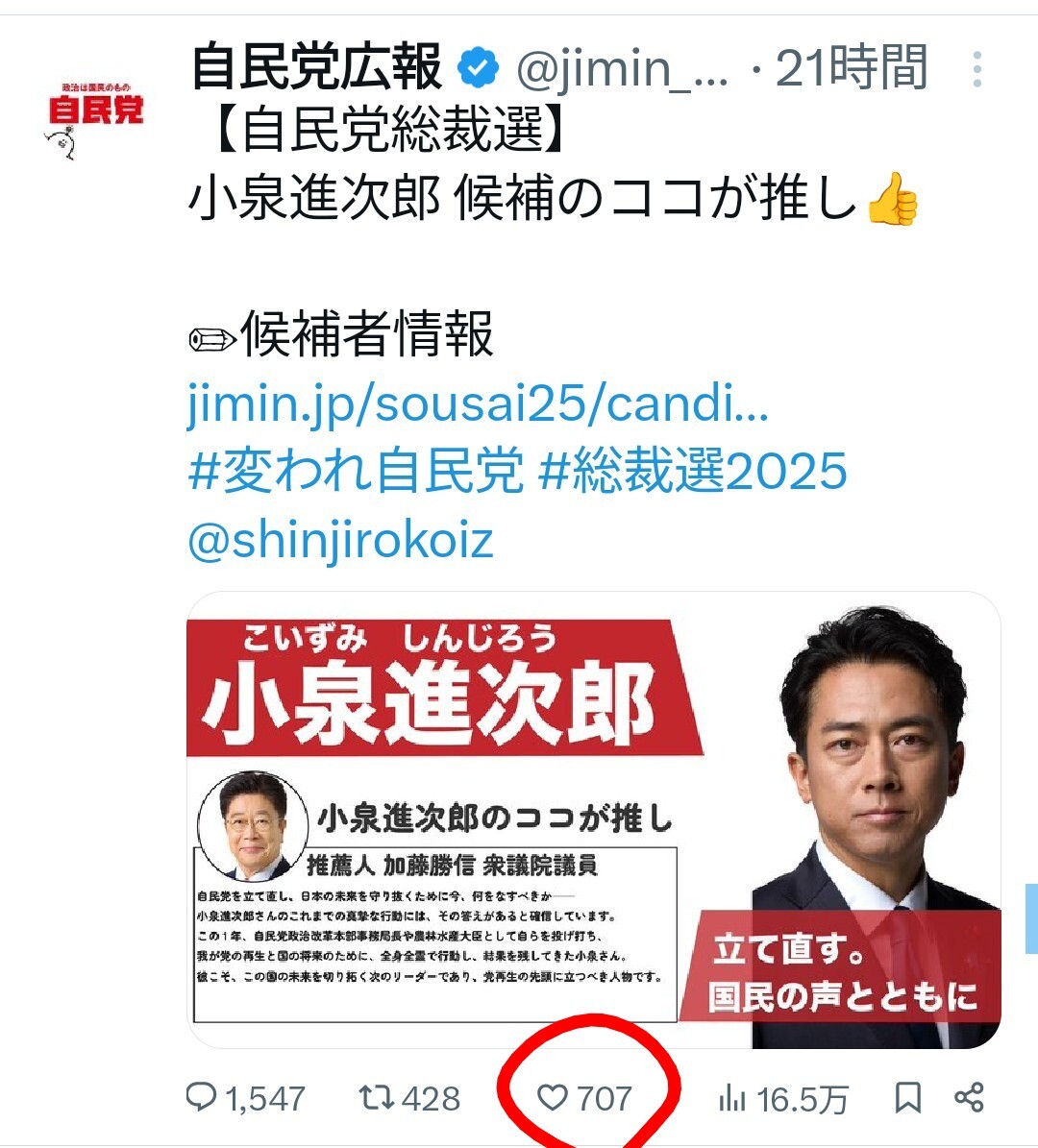 たったの21時間で、もう民意がはっきりと見えてるじゃん‼️ ♥ 20000 対 700 て🤣🤣🤣 民意を無視して滅ぶか 民意を意識して再生するか #自由民主党 #自民党 #総裁選 #次期総理大臣 #国益の高市早苗 #炎上の小泉進次郎 pic.x.com/bpW4WbQO5g x.com/jimin_koho/sta…