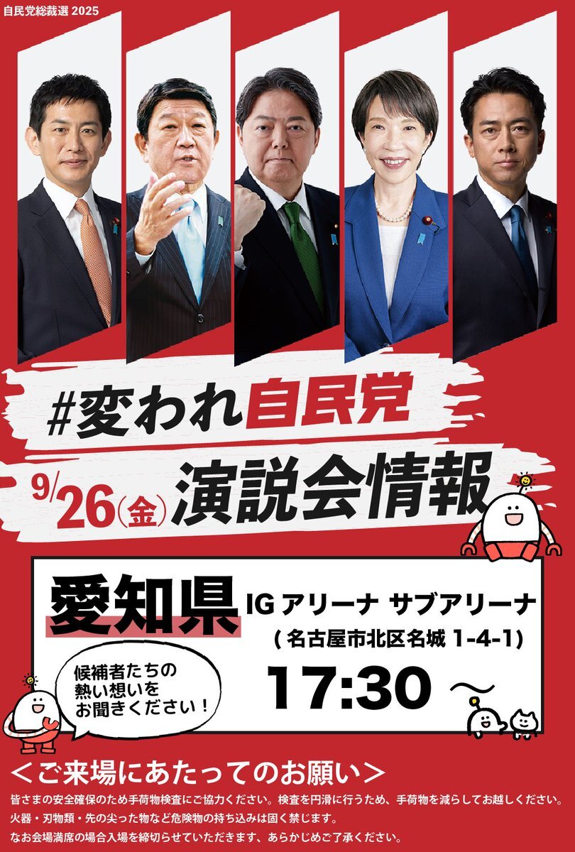 【総裁選スケジュール】 演説会(愛知県) 候補者たちの熱い想いをお聞きください! 📌9月26日(金) 17:30〜「IGアリーナ サブアリーナ」 ⚡️LIVE配信 youtube.com/live/9EsgvZUfu… #変われ自民党 #総裁選2025 @kobahawk @moteging @hayashi09615064 @takaichi_sanae @shinjirokoiz