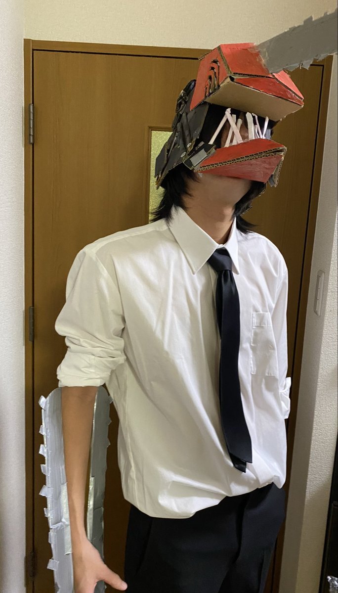 次男が劇場版チェンソーマンを観た後、ダンボールでせっせと作りました 歯はストローで出来ているのですが、上の歯を付けるの面倒くさかったとの事で、全体的に雑です 顔少し見えてるし #劇場版チェンソーマン #コスプレ #次男 pic.x.com/OwE9XMrPhf