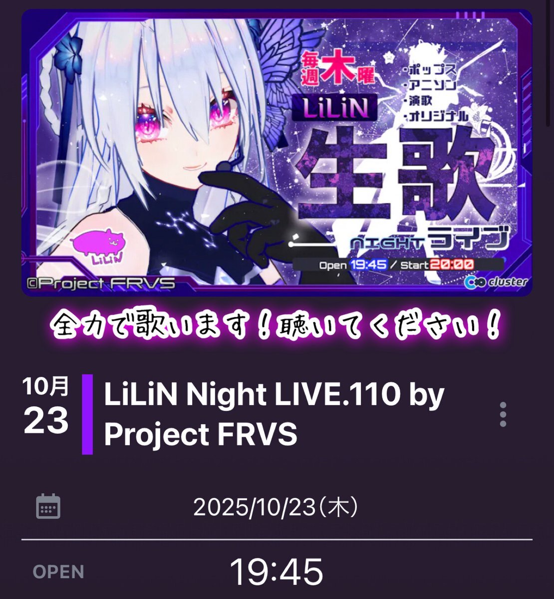 【#LiLiNclusterLIVE】 《LiLiN Night LIVE.110》 🗓10/23(木) op 19:45/st 20:00 🈁➡︎cluster.mu/e/f30600f5-343… マクロスの歌姫を、プロの歌手を目指し活動する #Vsinger です🎙 歌を聴いてください! #cluster 初心者さんも初見さんも大歓迎🔰 #ProjectFRVS #歌声が好みって人にフォローされたい pic.x.com/yMirwtNUD3