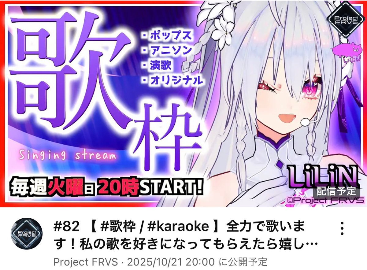 【#LiLiNyoutubeLIVE】 🗓10/21(火) 20時~YouTubeで歌います🎙 / #82 【 #歌枠 / #karaoke 】全力で歌います!私の歌を好きになってもらえたら嬉しいです🐹 ch➡︎ youtube.com/@ProjectFRVS?s… \ 当日朝のポストでリクエスト募集しています🫶🏻 お気軽にリプライもらえたら嬉しいです! #ProjectFRVS
