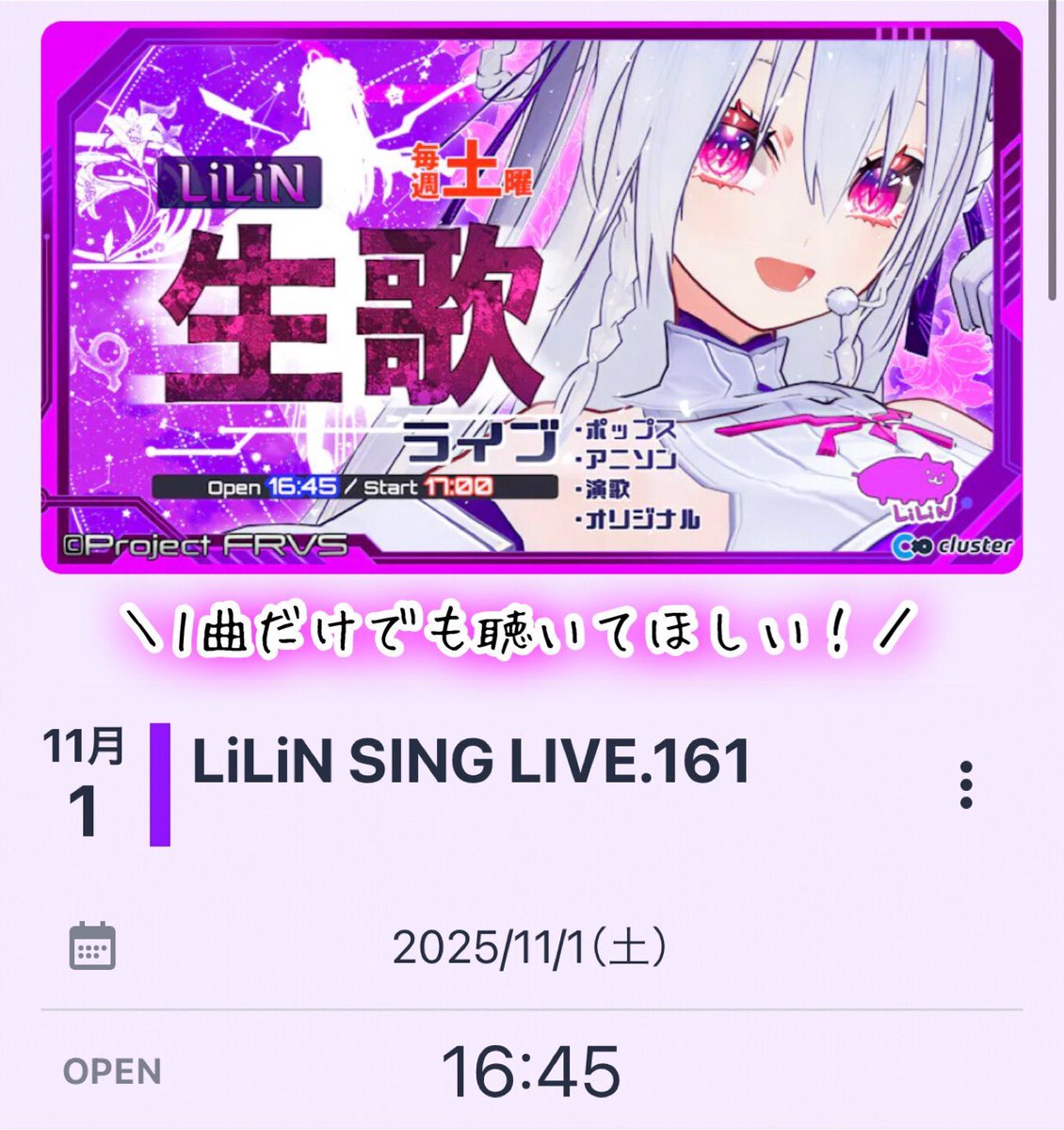 【#LiLiNclusterLIVE】 《LiLiN SING LIVE.161》 🗓11/1(土) op 16:45/st 17:00 🎪➡︎ cluster.mu/e/15713696-0e8… #マクロス の歌姫を プロの歌手を目指す #Vsinger です! 「#cluster 始めてみたけど…どこで何すればいいの🥺?」 という方もお気軽にお越しください🔰🫶🏻 #ProjectFRVS #VR