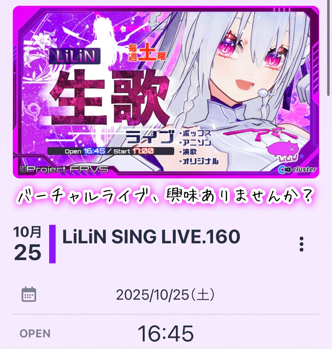 【#LiLiNclusterLIVE】 《LiLiN SING LIVE.160》 🗓10/25(土) op 16:45/st 17:00 🎪➡︎ cluster.mu/e/1b9bd37f-027… #マクロス の歌姫を プロの歌手を目指す #Vsinger です! 「#cluster 始めてみたけど…どこで何すればいいの🥺?」 という方もお気軽にお越しください🔰🫶🏻 #ProjectFRVS #VR