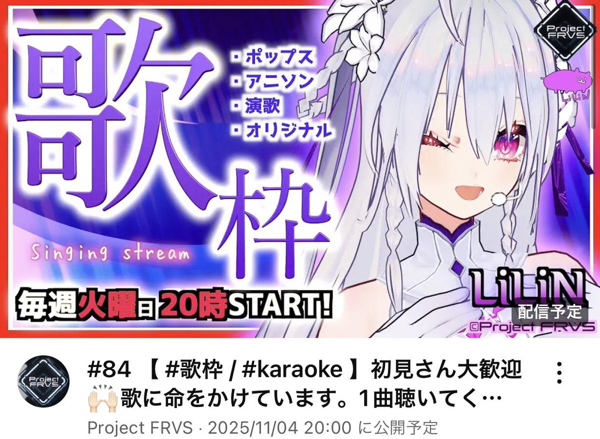 【#LiLiNyoutubeLIVE】 🗓11/11(火) 20時~YouTubeで歌います🎙 / #85 【 #歌枠 / #karaoke 】今日は「いい出会いの日」!初見さん大歓迎です🐹歌を聴いてほしい! ch➡︎ youtube.com/@ProjectFRVS?s… \ 📣<#歌声が好みって人にフォローされたい !! 通知設定をして待機ください🔔 #ProjectFRVS pic.x.com/SB1hvME8SA