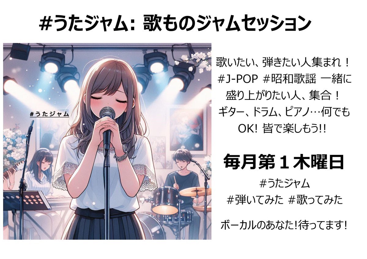 #うたジャム です 東京の御徒町で毎月第1木曜日に開催される、歌好きにはたまらないイベントです。初心者からプロまで、誰でも参加できて、その場で一緒に歌ったり演奏したりできます。事前準備なしで飛び込める気軽さが魅力で、J-POPアニソン昭和歌謡いろんなジャンルが飛び交う楽しい雰囲気です。 x.com/chubey135/stat…