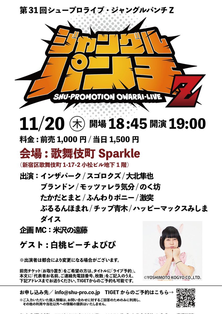 今月のシュープロ事務所お笑いライブ「ジャングルパンチZ」ゲストは白桃ピーチよぴぴさんです!!今月も全力で頑張ります!!お客様のご来場お待ちしております!! #ジャパゼット #お笑いライブ #歌舞伎町Sparkle #11月20日 #ゲスト #白桃ピーチよぴぴ #お客様のご来場 #お待ちしております pic.x.com/uxh8lynzT4