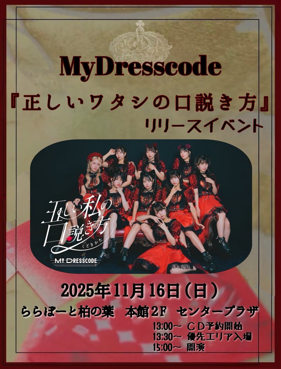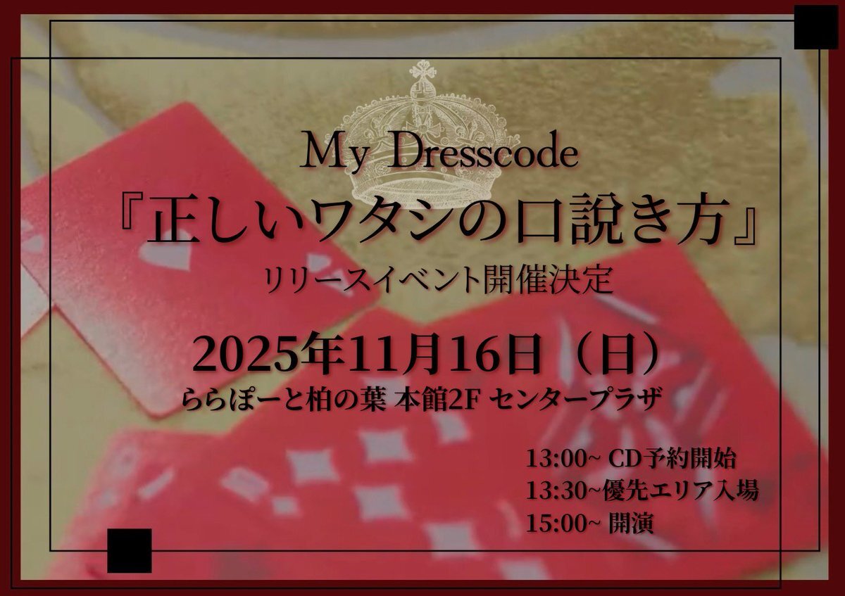✨明日はリリイベ✨ 💿MyDresscode 1stシングル💿 『正しいワタシの口説き方』 Melty BeaRさんとの 合同リリースイベント開催決定🎉 📅11/16(日)15:00〜 📍ららぽーと柏の葉 本館2F センタープラザ 13:30〜CDご予約で⬇️ 🎫優先エリア入場券(整理番号入り) x.com/_mydresscode_/…