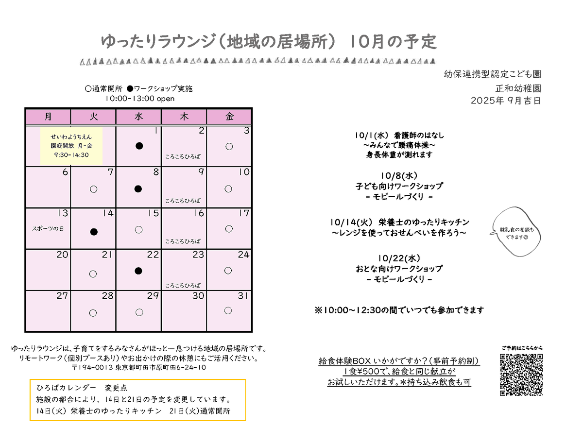 📣#ゆったりラウンジ(地域の居場所)10月予定&変更のお知らせ #正和幼稚園 では #子育て 中の皆さんがほっと一息つける居場所を開放中🌿 10/14(火)は「栄養士のゆったりキッチン」🍘 10/21(火)は通常開所✨ 🕙10:00~12:30 📍#つながりこども送迎ラウンジ #町田市 原町田6-24-10 #ワークショップ pic.x.com/4Lq8BGmh5O
