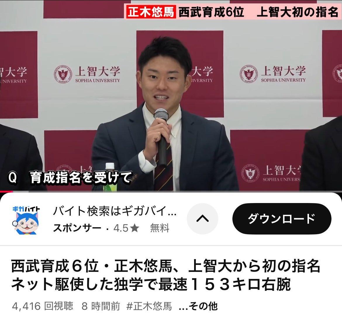 【動画】西武育成6位・ #正木悠馬、上智大から初の指名 ネット駆使した独学で最速153キロ右腕 sanspo.com/article/202510… #埼玉西武ライオンズ #seibulions 西武から育成ドラフト6位で指名された上智大・正木悠馬投手が24日、東京・四谷の同校で会見した。