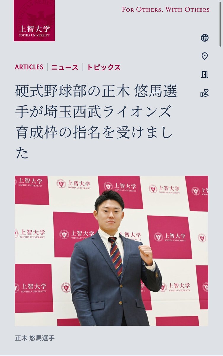 まさか推しのチームが我が母校の選手を指名する日が来るとは つーかプロスポーツ選手卒業生なんてマジで聞いたことないんだけど😳 支配下勝ち取って活躍してね正木くん💪 #Seibulions #正木悠馬 #上智大学 x.com/pacificleaguet…