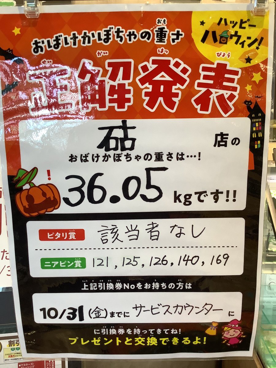 正解発表‼️ 砧店のおばけかぼちゃの重さは 「36.05Kg🎃」でした❣️ ニアピン賞の方は引換券を持って サービスカウンターへお越しください💓 素敵なプレゼント🎁を差し上げます🤗 10/31(金)までです😃 #サミット #おばけかぼちゃ #正解発表 pic.x.com/5U8yq9jure