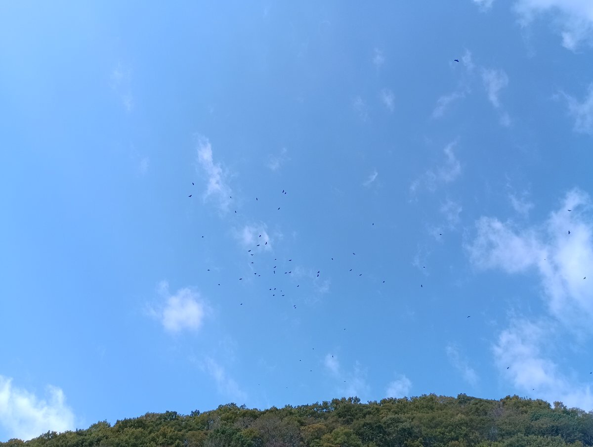 #正解発表 です 答えは②のカラスでした 写真では見えにくいですが 黒い細かな点が全てカラスです しかも鳴かずに飛んでました カラスさんたち、ごめんね_(_^_)_ #カラス pic.x.com/bvRpJfoopb