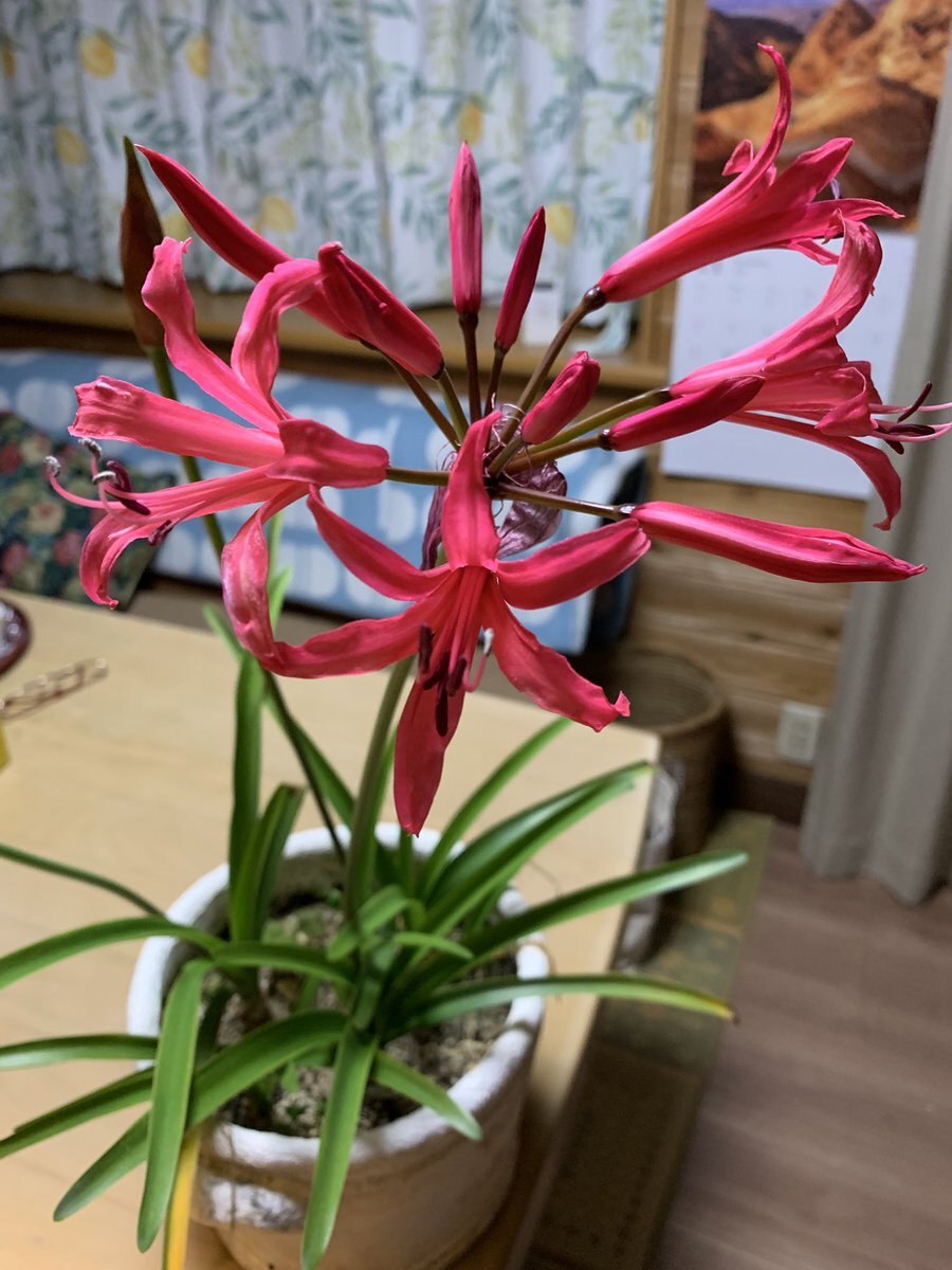 昼寝してなくて良かった! 友達が #ネリネ #ダイヤモンドリリー の蕾がいっぱい出ている鉢を持って来てくれました♪5年くらい前に球根を植えた鉢をもらったのに一度も咲かず、今年も咲きそうにないのです💦何が悪いのか? #ガーデニング #武器より花を pic.x.com/Gf7w18agZw