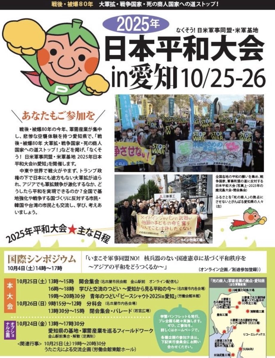 いよいよ本日、開催です 愛知には、全国唯一とも言える、ミサイル生産拠点があります 敵基地攻撃能力は、必要のない軍事緊張を高めるだけです 戦争拠点あいちを平和の拠点へ 日本平和大会を開催します ぜひご参加ください #戦争反対