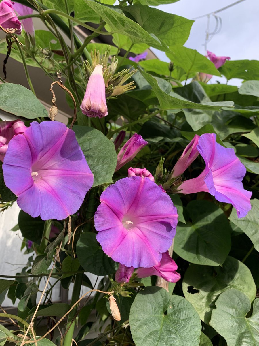 #今朝の狭庭 冬間近、さしもの宿根朝顔も群青色からピンク系になって来ましたが、蕾がいっぱい。夏の蔓植物たちとの別れも決断力が必要です! 野ざらしを心に風のしむ身かな by芭蕉 #俳句 #ガーデニング #武器より花を #NoWar pic.x.com/vyuGTgslvu